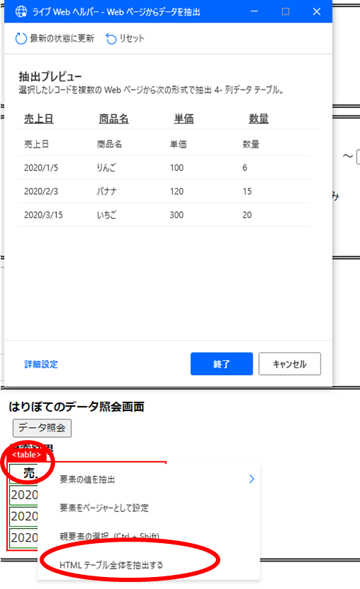 ↑こういうモードになるので、表全体が赤枠で囲まれるところで右クリック → HTML全体を抽出する
