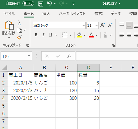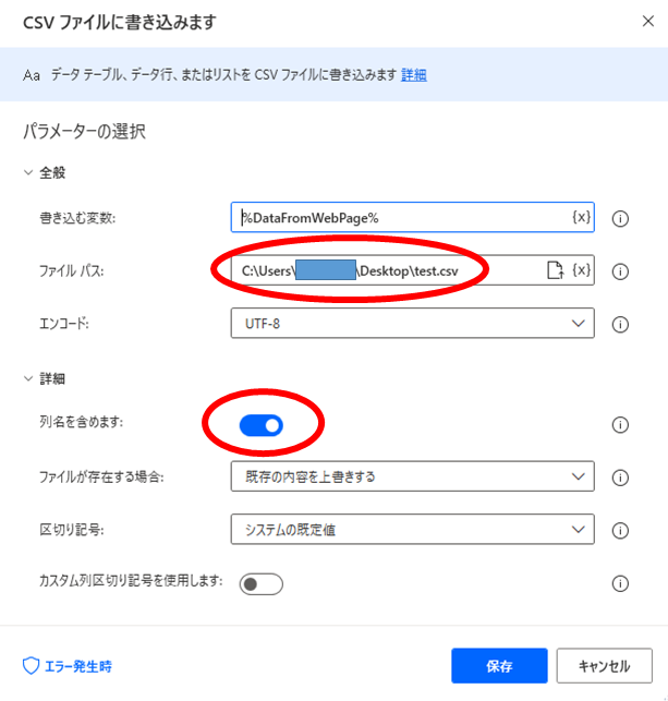 出力したいファイルをフルパスで指定、列名を含めたい場合はオンにする。