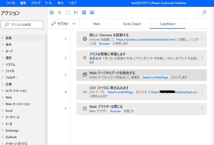 全体概要 ・フローが長くなったのでメモ帳の処理とExcelの処理にサブフローで分けた。◆メモ帳の処理①csvファイルをメモ帳で開く②念のため①で開いたメモ帳の入力部分にフォーカス③タブを入力→Shif ...