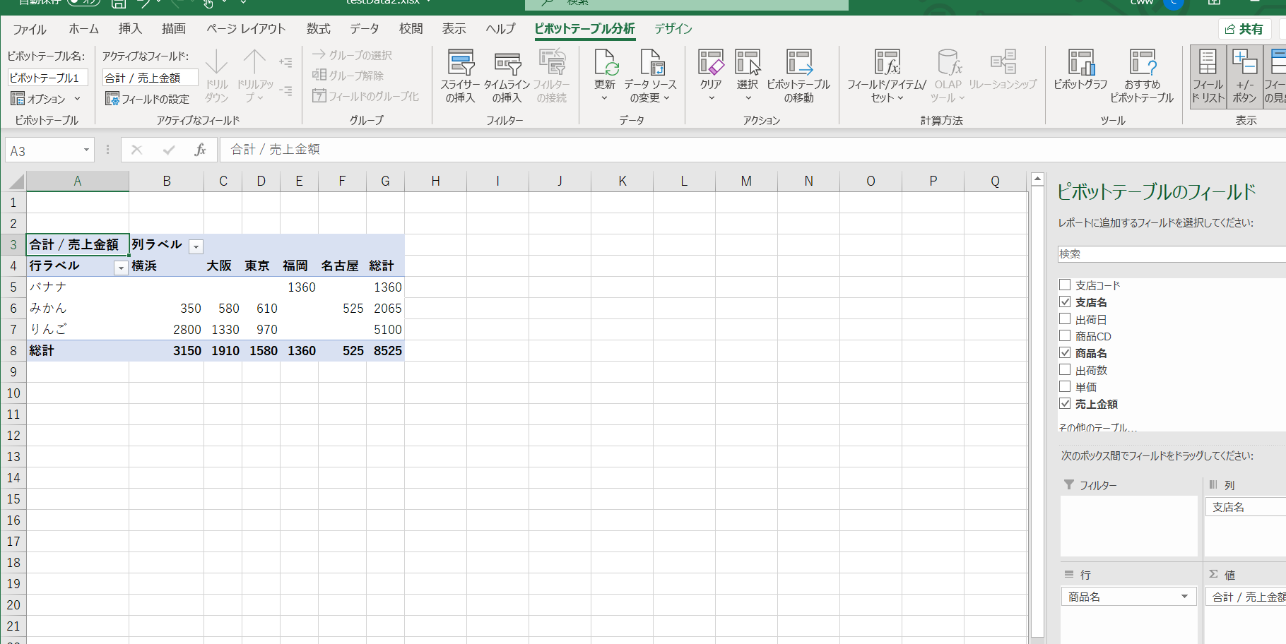 挿入→ピボットテーブル→OK→支店名を左クリック→支店名を右クリック→列ラベルに追加→商品名を左クリック→商品名を右クリック→行ラベルに追加→売上金額を左クリック→売上金額を右クリック→値に追加