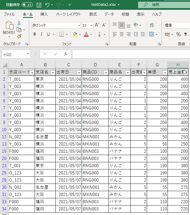 【目標】Excelを開く → フィルターを設定 → 金額が200円以上 500円未満のデータをフィルタリングする。