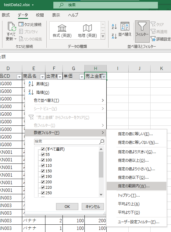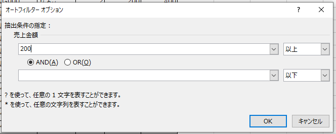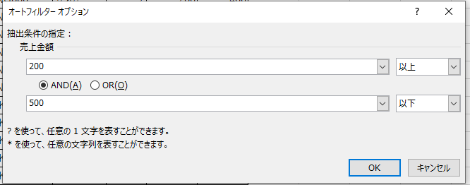 F → W で数値フィルタ→数値の範囲指定