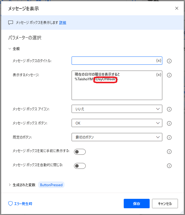 .DayOfWeekで曜日を取得(←これの前の変数は日付型でないといけない)