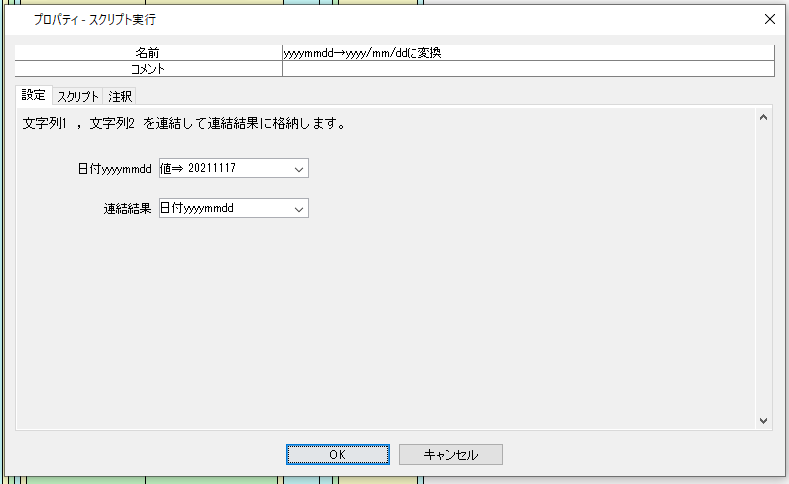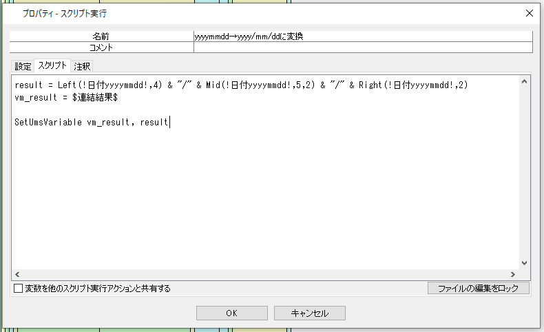変数一覧 「曜日」という変数を作成 シナリオ スクリプト実行_曜日取得 ノードのスクリプト実行をドラッグ ↓ スクリプトタブを選択して以下のように記述 result = Weekday(!対象のyyy ...