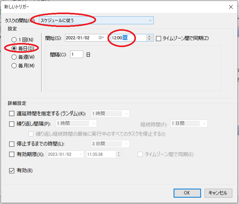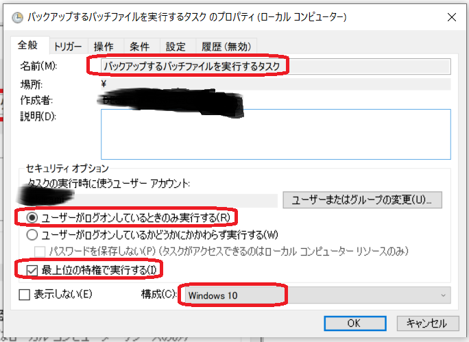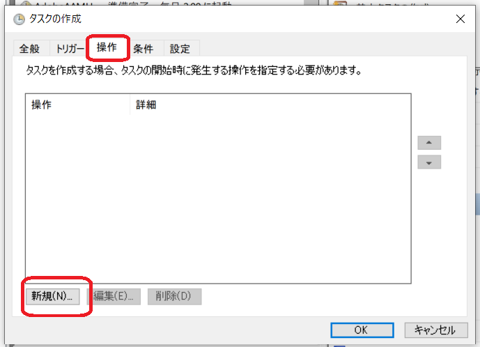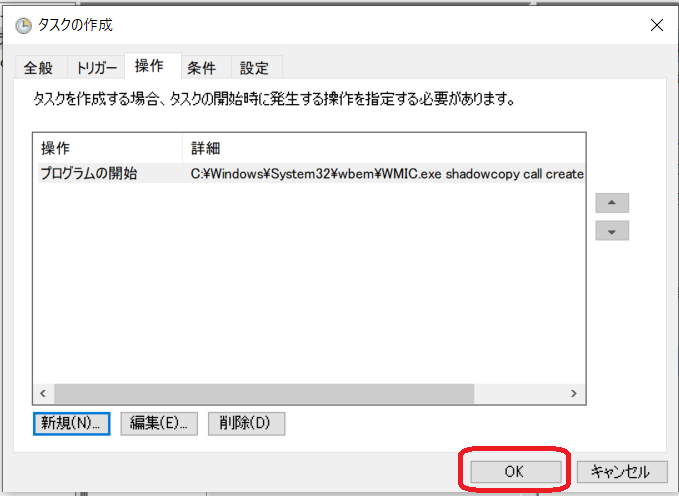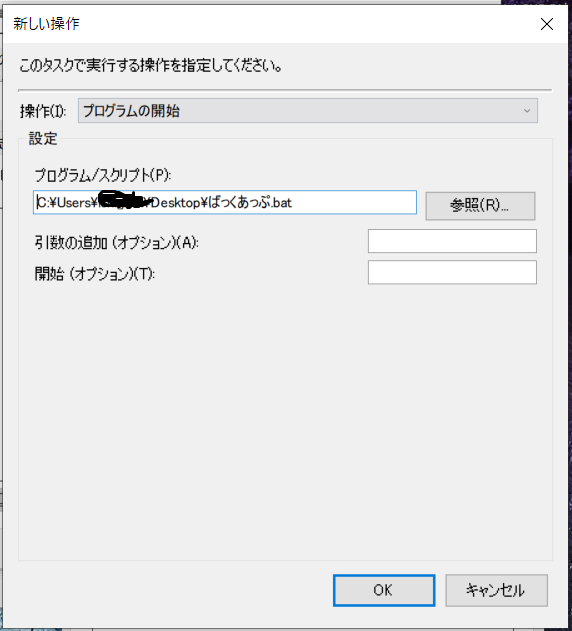 このバッチファイルをタスクスケジューラで実行するように設定