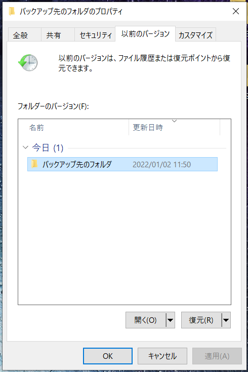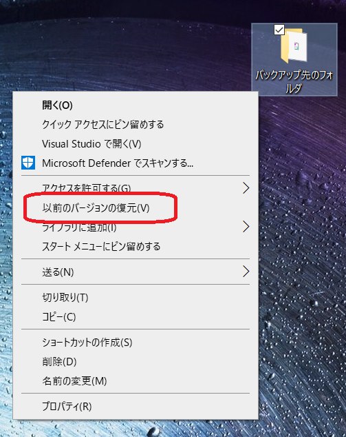 復元したいフォルダを右クリック → 以前のバージョンを復元