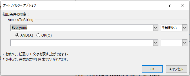 AccessToStringという列に「Everyone」を含まない行がなんかしらの権限設定がされてるフォルダなんじゃないかな~