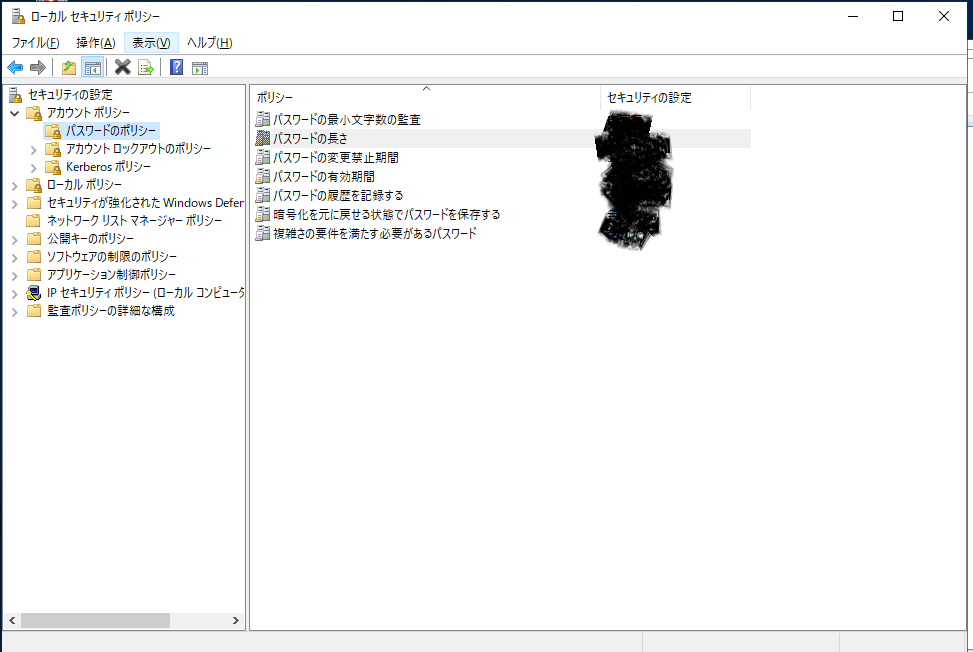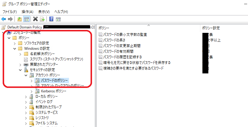 コンピューターの構成→ポリシー→Windowsの設定→セキュリティの設定→アカウントポリシー→パスワードのポリシー
