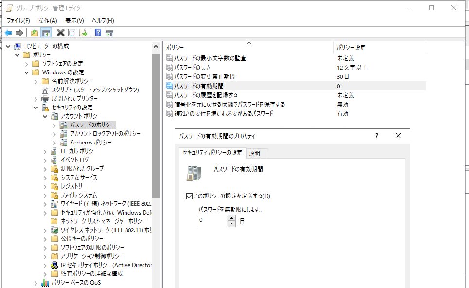 パスワードの有効期限を無期限にする場合は未定義ではなくゼロ日を設定
