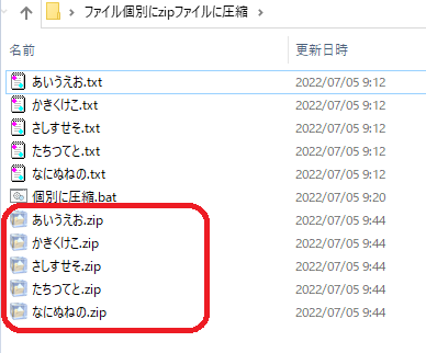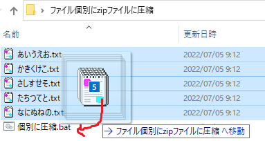 ファイルやフォルダを複数選択して、今作ったバッチファイルにドラッグ・アンド・ドロップ。