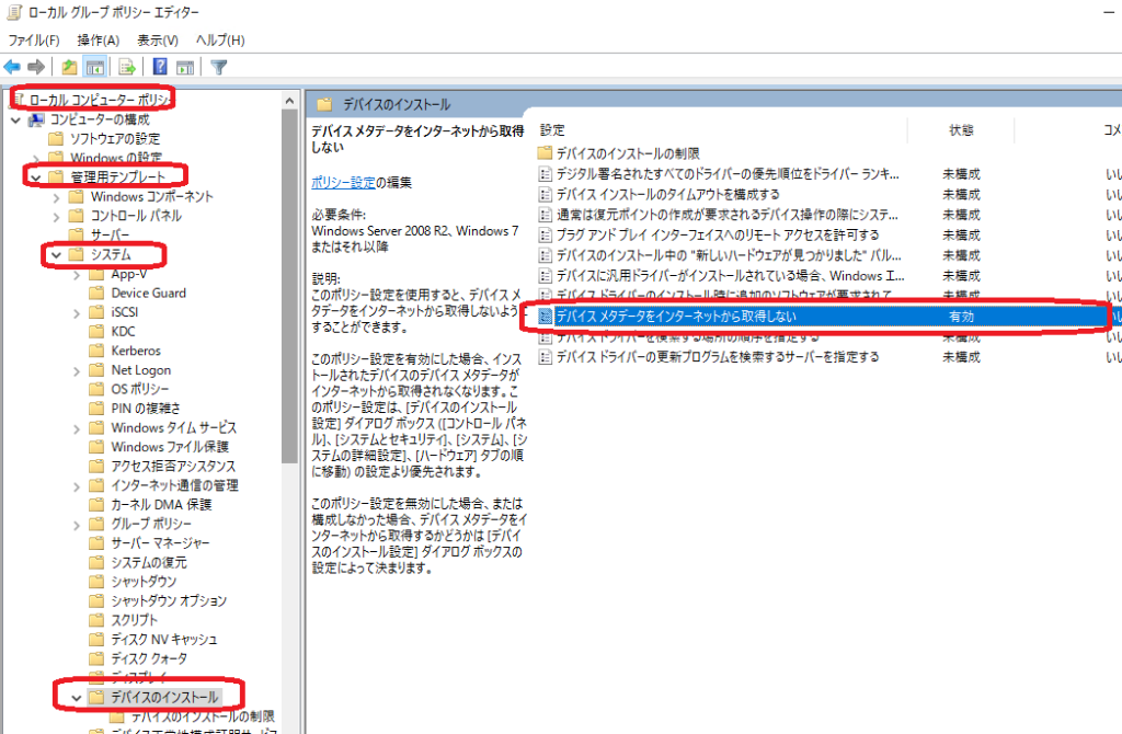 デバイス メタデータをインターネットから取得しない を有効にする。