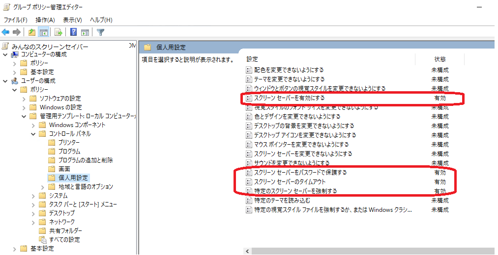 上記ツリーの⑥みんなのスクリーンセイバーを右クリック→編集 グループポリシー管理エディタが開く